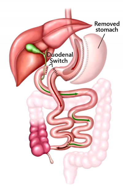 La derivación biliopancreática con switch duodenal (también llamada switch duodenal o BPD-DS) es un procedimiento complejo que induce la pérdida de peso mediante una gastrectomía en manga y un bypass intestinal. Este método da lugar a una disminución de la absorción de los alimentos. Con este procedimiento, el cirujano extirpa aproximadamente el 60-70 por ciento del estómago para que éste adopte la forma de un tubo (gastrectomía en manga). A continuación, el intestino inferior se divide mucho más abajo que en el caso del bypass gástrico, de modo que se evitan dos tercios o más del intestino, dejando sólo unos pocos metros de intestino donde se encuentran los alimentos y las enzimas digestivas. Esta es la parte de la operación que consiste en un bypass intestinal. El nombre de cambio duodenal viene del hecho de que en esta operación el bypass intestinal comienza en el duodeno. La primera parte del intestino, el duodeno, se divide y se une a la parte inferior del intestino delgado, el íleon.